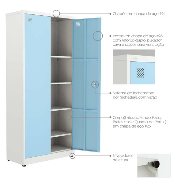 - Durabilidade: A construção em aço é resistente a danos e garante uma longa vida útil para o armário.