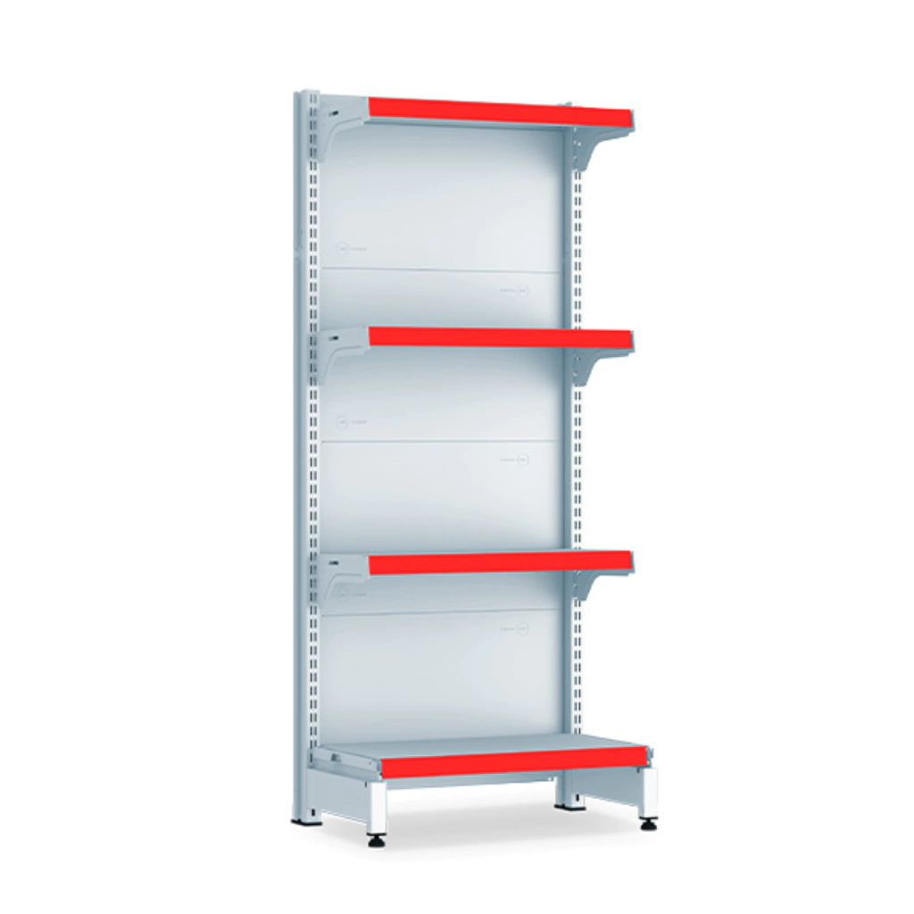Expositor de 400 mm de profundidade especialmente calibrado para a extremidade de corredores em drogarias, perfumarias e lojas de dermocosméticos, com capacidade de 80 kg por prateleira, montagem ultrarrápida e retorno financeiro inferior a 12 meses.